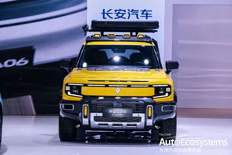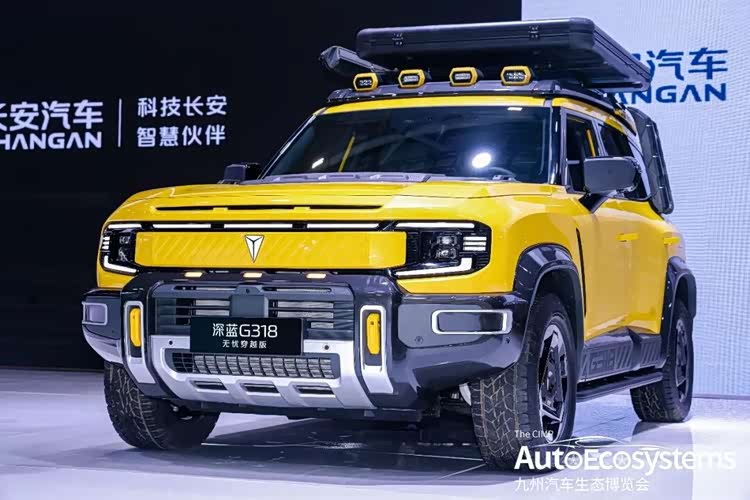 深蓝G318无忧穿越版,是深蓝汽车基于G318硬派越野SUV打造的原厂定制改装车型,主打全场景户外穿越与露营生活,是长安汽车“科技长安、智慧伙伴”品牌理念下的个性化产品。车型采用亮眼的明黄色专属车漆,搭配熏黑轮眉、竞技前杠与银灰护板,视觉冲击力拉满。核心改装围绕越野与露营场景打造:车顶配备可升降行李架与四盏LED探照灯,集成车顶帐篷;换装全地形AT越野轮胎与防脱圈轮毂,强化非铺装路面通过性;前杠预留拖车钩与绞盘安装位,满足专业穿越需求。