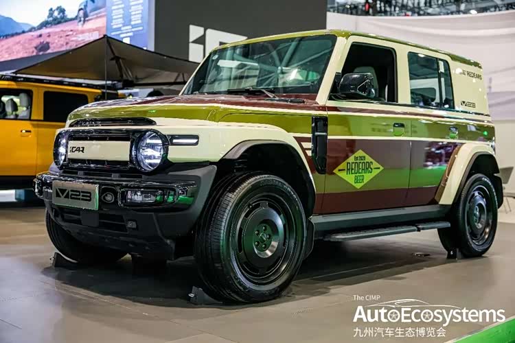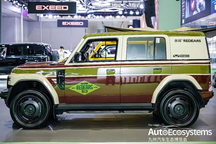 奇瑞新能源-iCARV23 REDEARS BEER联名定制改装版,是iCAR原厂改装生态下的场景化共创车型,基于iCAR V23纯电硬派SUV打造,主打复古潮玩与跨界社交属性。车型采用橄榄绿、奶白、酒红三色分层复古撞色涂装,车身侧面印有REDEARS BEER专属菱形标识,车尾同步标注联名元素,视觉辨识度拉满。外观配备原厂定制黑化前杠、全黑封闭式复古轮毂、同色宽体轮眉与侧踏板,在保留硬派方盒子造型的同时,强化美式复古质感。