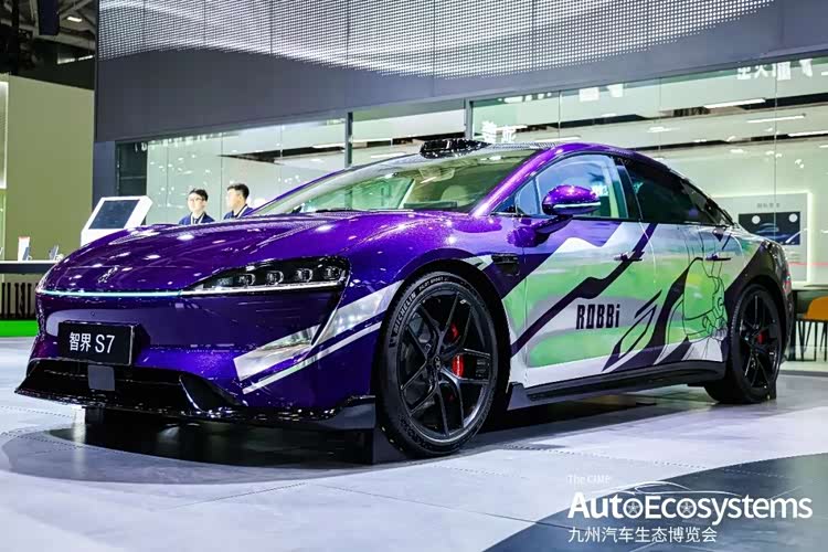 智界S7 ROBBi联名改装车,新车基于智界S7打造,全车采用星耀紫渐变车漆,车身侧面融入ROBBi潮流IP元素与艺术拉花,搭配“ROBBi”艺术字体,将先锋设计与汽车文化深度融合。外观同步升级运动套件:20英寸黑色锻造轮毂、红色刹车卡钳与碳纤维前铲,强化运动气息,0.195Cd超低风阻兼顾颜值与能效。