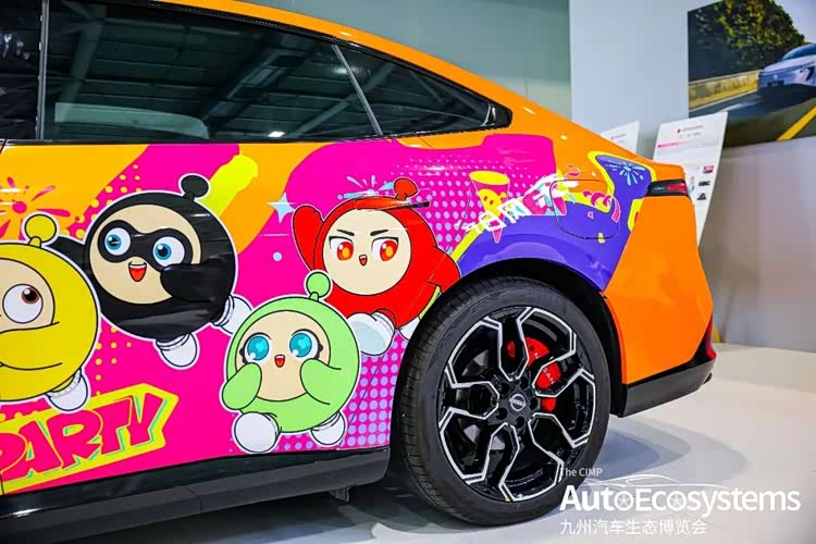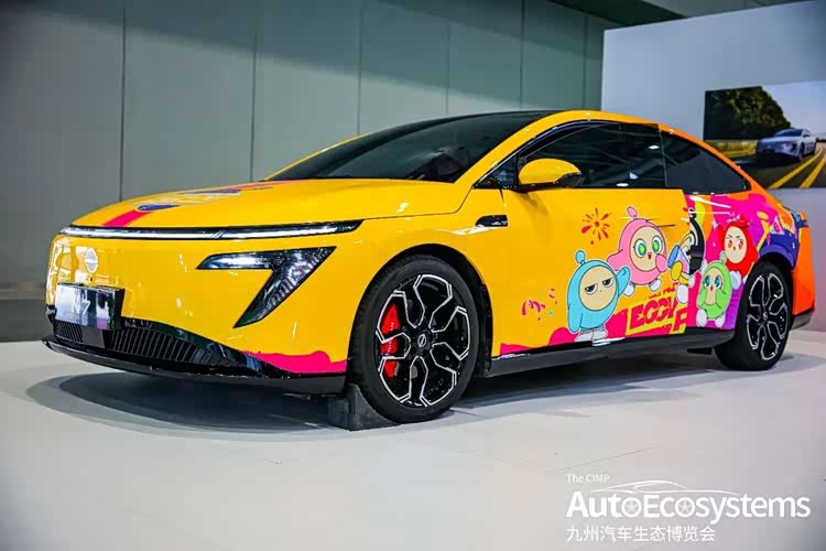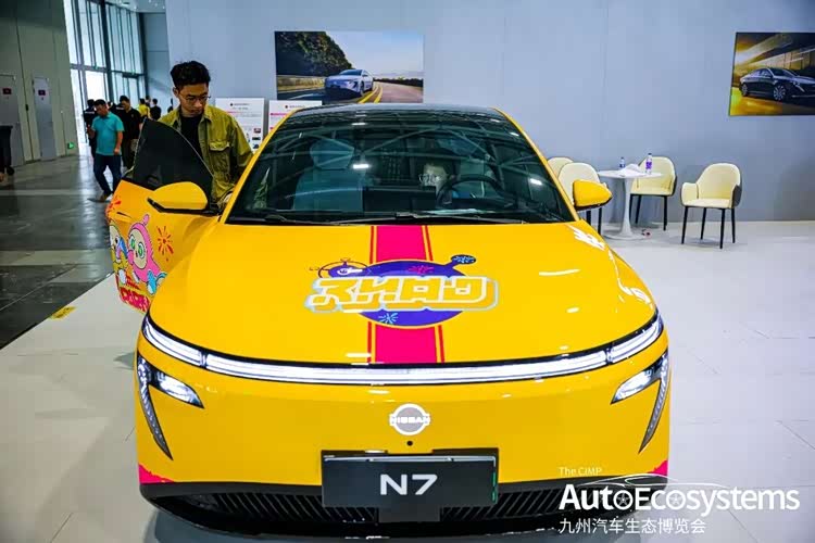 东风日产东风日产N7纯电中大型轿车的蛋仔派对联名定制涂装版。车辆以亮黄色为基底,车身侧面绘制了蛋仔派对系列卡通形象,搭配粉紫撞色涂鸦与“EGGY”主题元素,将潮流二次元文化与纯电车型深度融合,精准触达年轻消费群体。
