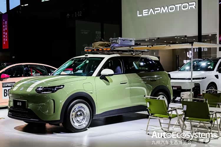 零跑汽车零跑A10户外露营定制改装版,以潮流复古+露营生活方式为主题亮相,成为现场年轻家用与户外爱好者的核心关注车型。车辆基于零跑A10原厂车型打造,采用抹茶绿+米白撞色涂装,搭配贯穿式白色拉花,视觉清新治愈。前脸延续零跑家族式封闭式设计与贯穿式日行灯,升级复古风格镀铬轮毂与白边轮胎,强化个性化审美;车顶加装拓展行李架、长条射灯与侧遮阳棚,搭配户外露营装备,将纯电家用SUV与旅居生活深度融合,适配短途自驾、户外露营等场景。