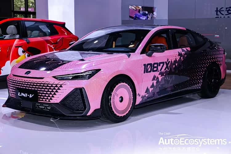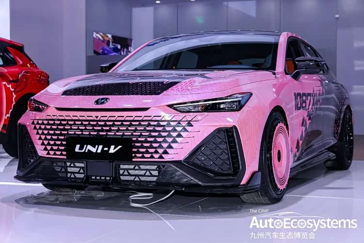 长安UNI-V 1087X定制改装版,是长安汽车基于UNI-V运动轿跑打造的潮玩定制车型,主打年轻个性化与视觉张力,精准击中Z世代改装玩家需求。车型采用粉黑渐变专属涂装,车身融入等高线纹理与三角几何图案,侧面印有“1087X”标识,搭配熏黑车顶、碳纤维后视镜与运动侧裙,视觉辨识度拉满。前脸配备UNI-V专属无边界格栅与运动前铲,换装全黑运动轮毂,前轮采用粉色复古白边设计,强化潮玩属性;内饰采用橙黑撞色运动座椅,呼应外观风格。