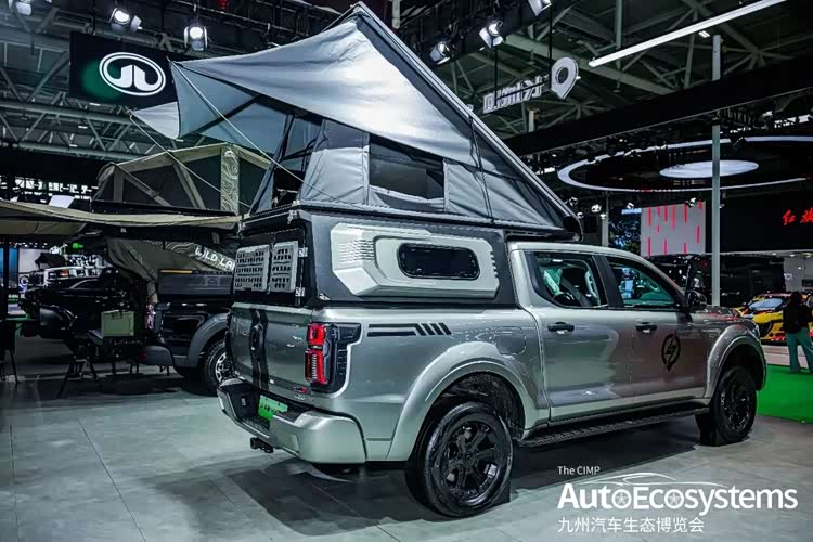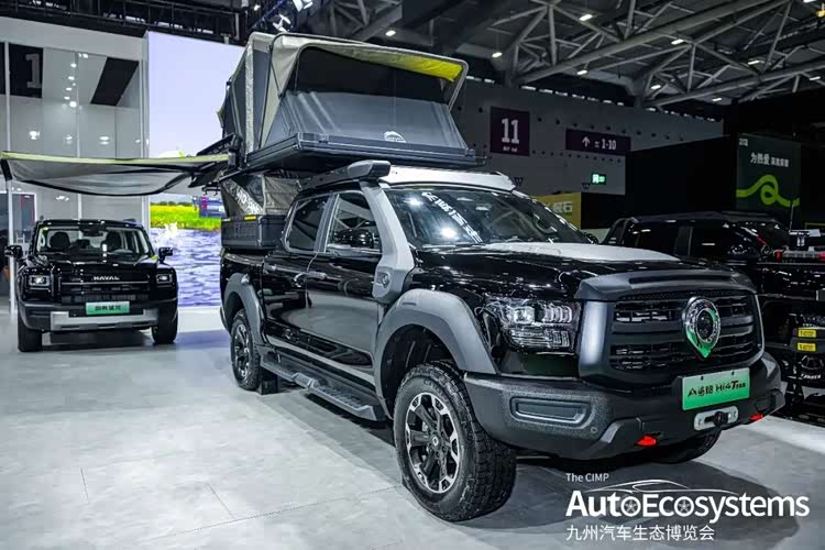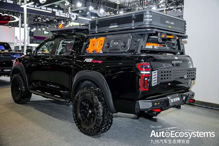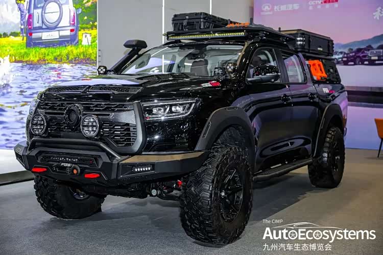 越野炮越野改装版本,该车以“全黑化”竞技风格亮相,完美诠释了硬派越野与户外露营的极致结合。车辆外观全面升级,全车采用哑光黑车身涂装,搭配极具攻击性的竞技前杠,集成了红色拖车钩与辅助照明模组,视觉冲击力拉满。底盘进行了高强度升高,配合大尺寸AT越野轮胎与多辐式防脱轮毂,大幅提升通过性与抓地力,轻松应对复杂路况。车顶加装了拓展行李架与辅助灯,货箱配备户外装备收纳箱与备胎支架,满足长途穿越、深度越野的装备装载需求。