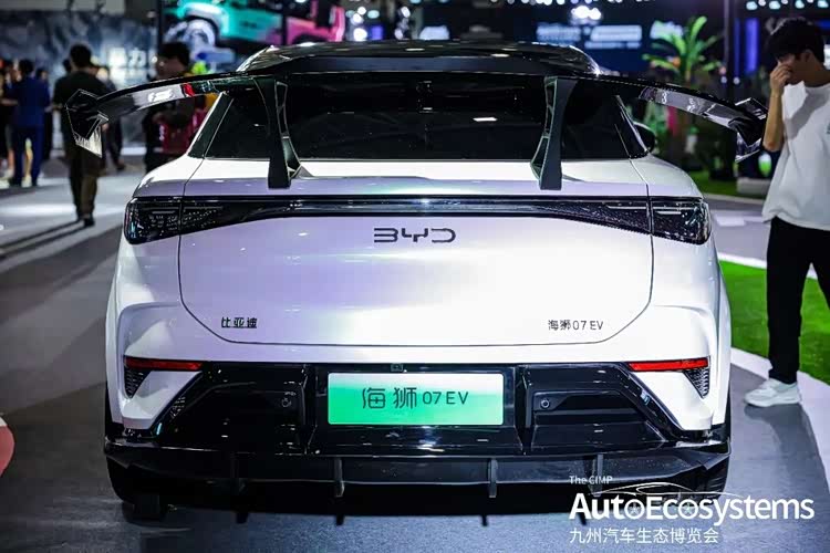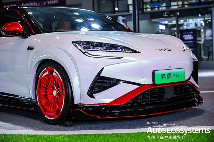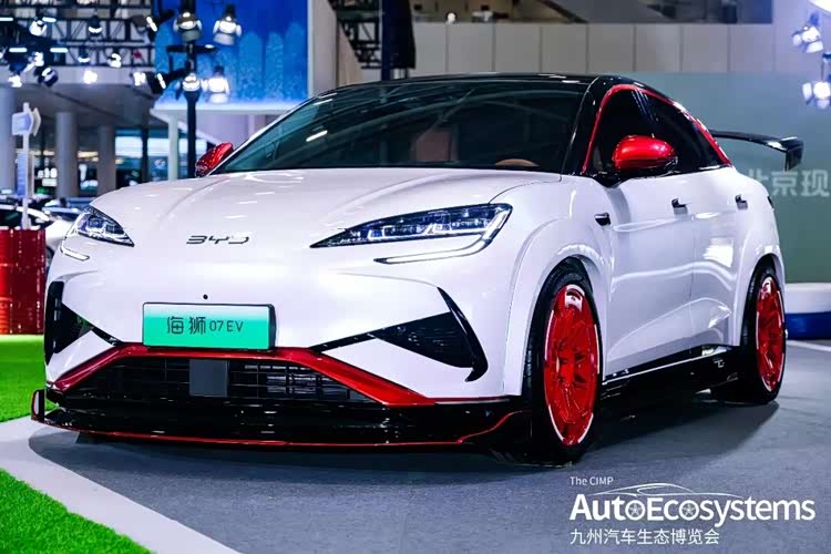 比亚迪汽车在展会上,比亚迪海洋网带来了一台定制改装版海狮07 EV,以极致运动姿态引爆现场。整车采用珍珠白为基底,搭配亮红撞色套件,视觉冲击力拉满。前脸升级三段式运动前铲,黑红饰条贯穿下唇,搭配锐利的贯穿式大灯与黑化BYD标识,攻击性十足;侧面车身大幅降低,呈现低趴姿态,定制多辐式竞技红轮毂与红色后视镜、A柱饰条呼应,运动感贯穿全身;尾部搭载大尺寸双层扰流尾翼,进一步强化了竞速属性。