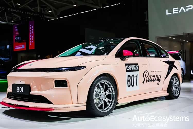 零跑B01原厂赛道改装版,基于零跑B01量产车型深度打造,主打年轻性能与个性化改装市场。车辆以樱花粉为基底,搭配黑红双拼拉花、竞技前铲、侧裙与大尾翼,车身印有“LEAPMOTOR”“Racing B01”等赛事主题标识,升级多辐式运动轮毂与红色刹车卡钳,强化空气动力学与视觉冲击力;车顶保留激光雷达,延续了零跑原厂智驾配置,兼顾赛道性能与智能化。