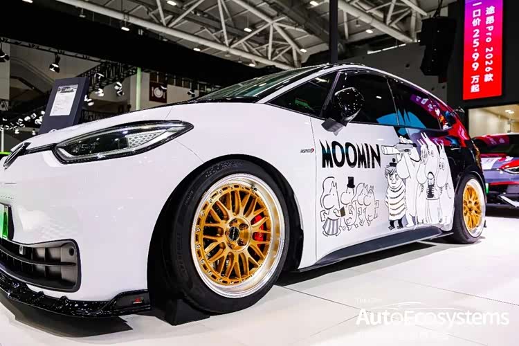 上汽大众大众ID.3姆明MOOMIN联名改装车惊艳登场,以萌趣IP+低趴改装的反差感,成为全场最具话题度的纯电小车。新车基于大众ID.3打造,车身采用纯白底色,侧面印有姆明家族全员卡通拉花,搭配“MOOMIN”艺术字体,将北欧童话IP与汽车文化深度融合。外观同步升级改装套件:定制金色多辐锻造轮毂、红色刹车卡钳、黑色前铲与低趴姿态,兼顾萌趣与运动感,精准击中年轻用户与IP爱好者审美。