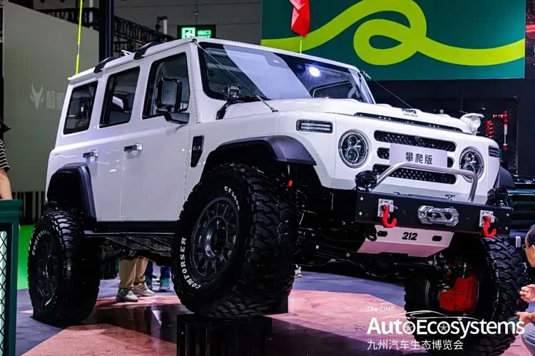 北京212 T01攀爬版,是212品牌面向极限越野场景打造的原厂深度改装车型,车辆延续212经典方盒子造型,采用纯白车身涂装,视觉干净硬朗。前脸升级高强度竞技前杠,集成12000磅WARN绞盘与双红色拖车钩,底盘进行了大幅升高,搭配大尺寸MT泥地轮胎与轻量化防脱轮毂,配合红色竞技刹车卡钳,将越野通过性与抓地力拉满,完美适配岩石攀爬、重度越野等极限场景。车顶加装拓展行李架,车身配备防滚架与侧踏,全方位强化越野防护,非承载式车身+分时四驱系统,保障极致脱困能力。