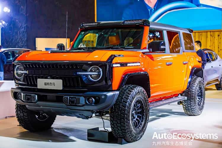 江铃福特江铃福特烈马四门版,是福特经典硬派越野车型,本次以原厂越野改装版本亮相。车辆采用亮橙+哑光黑撞色涂装,延续烈马经典方盒子硬派造型。前脸配备原厂竞技防护前杠,车顶加装长条射灯,底盘搭载非承载式车身与分时四驱系统,升级大尺寸MT泥地轮胎与防脱轮毂,底盘升高,强化越野通过性,适配沙漠、岩石、长途穿越等场景。