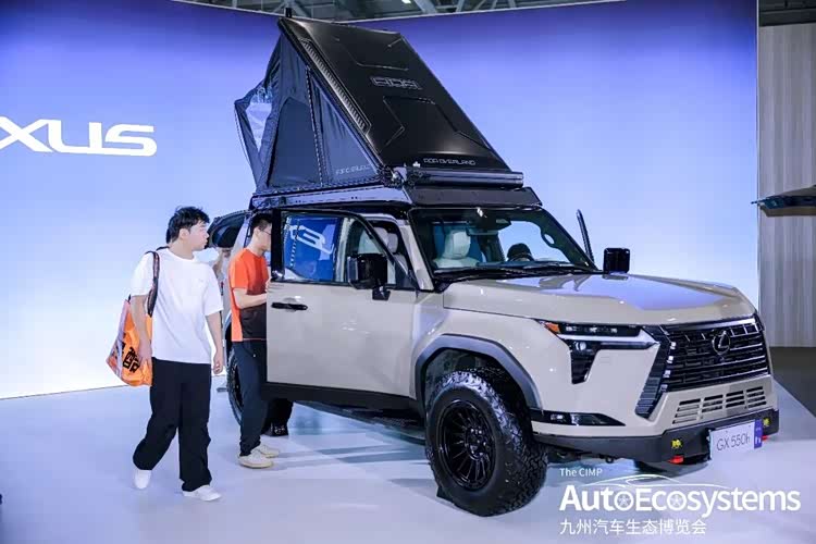 雷克萨斯雷克萨斯展台展出的GX 550h硬派越野SUV,车辆搭载2.4T混动系统,配备非承载车身与中央差速锁,兼顾越野性能与豪华感。此次展车重点升级了户外露营属性,车顶加装了可升降式拓展帐篷,配合越野轮毂与AT胎,完美适配户外旅居与深度越野场景。