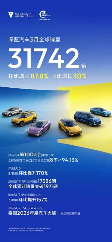 近日,深蓝汽车正式披露月度销量数据:3月全球销量31,742辆,环比增长87.8%,同比增长30%,实现同比、环比双增长。其中,深蓝L06表现尤为亮眼,单月销量5135辆,环比增幅高达170%,用实打实的市场反馈印证其越级产品实力与用户认可度