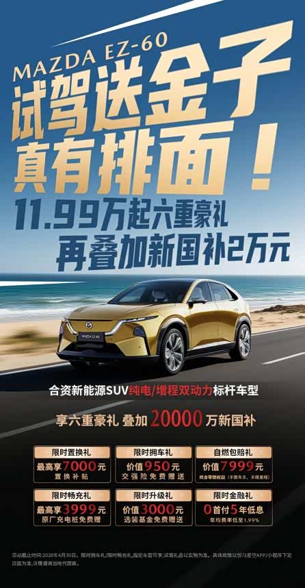 即日起至2026年4月30日,长安马自达MAZDA EZ-60全球新能源车型送出“史上最具「含金量」的购车权益”——进店试驾EZ-60即可获赠南京国家级非遗——金陵金箔。此外,活动期间,EZ-60在至高20000元以旧换新国补基础上,更推出价值23000元的6重专属购车礼遇,累计权益价值达到43000元: