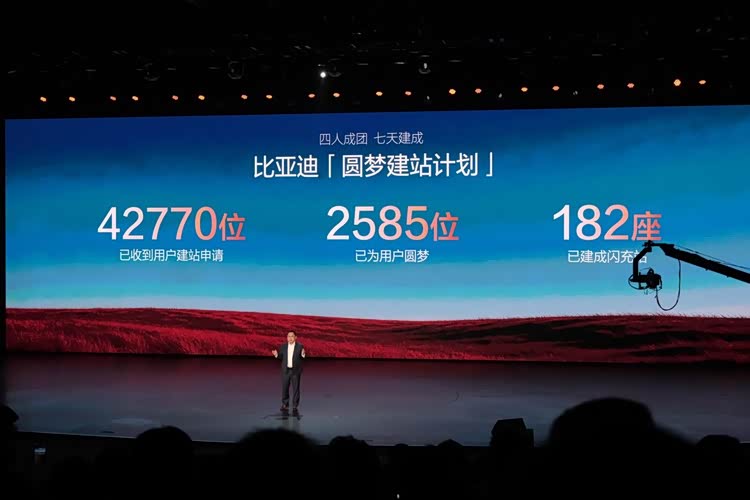 比亚迪还施行了用户共建模式,只要同一地点申请人数超过4人,比亚迪就可以启动“圆梦建站技术”,目前已经收到4.2万份申请,为2585位用户完成182座闪充站建设。并且,所有比亚迪用户提车后均可享受1年闪充站免费权益。