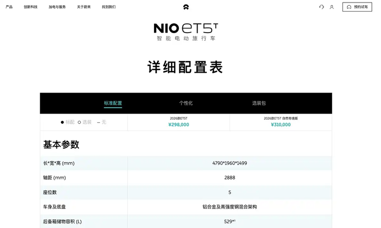 4月2日,蔚来汽车官方宣布,2026款 蔚来ET5(参数|询价)(中型轿车)与2026款ET5T(旅行版)正式上市。其中,ET5整车购买售价为29.80万元起,电池租用方案售价19.00万元起;ET5T整车购买售价区间为29.80万元起,电池租用方案售价19万元起。
