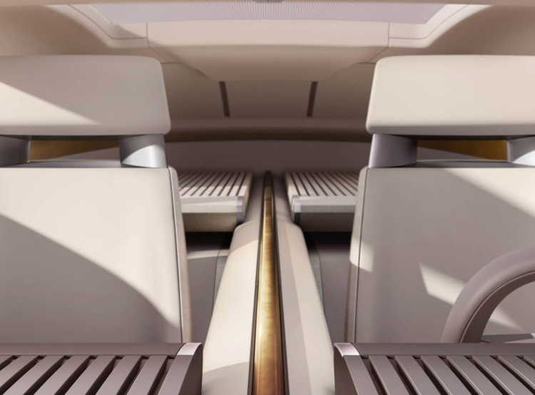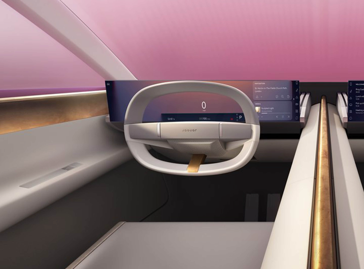 进入车内, 捷豹Type 00(参数|询价)概念车采用了大面积米白色高端软性材质铺陈,还加入了黑灰色饰板,仿木纹装饰板以及金箔纸装饰模块,层次感丰富,也更加高级。中控台也进行了大胆、突破、创新,取消了所有的物理按键,配备了矩形的灰色+米白的多功能触摸方向盘,预计将会加入AR-HUD抬头显示系统,可以让驾驶员更好的掌握车辆的动态行驶信息。车内配备了四个模块化的环保赛车座椅。