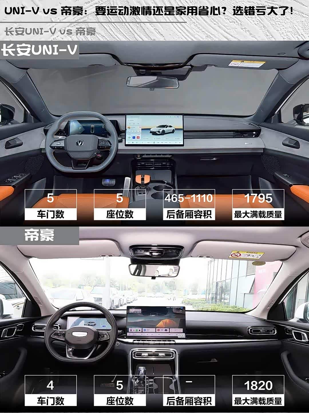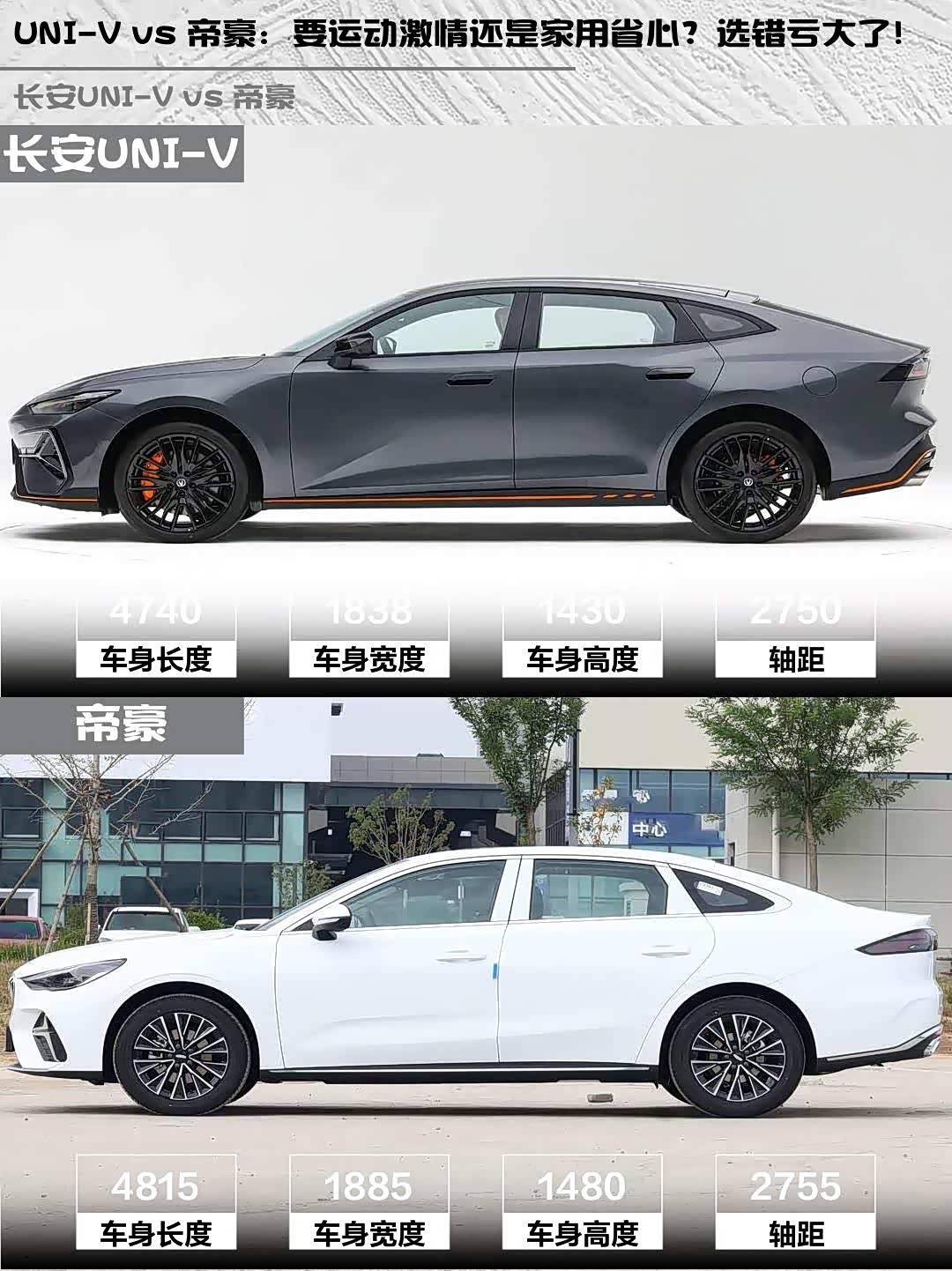 帝豪车身更长(4815mm vs 4740mm),后排头部空间更宽松。但UNI-V掀背设计后备厢能扩展到1110L,装大件更灵活。不过高个子坐UNI-V后排会有点顶头,建议1.8m以下考虑👔