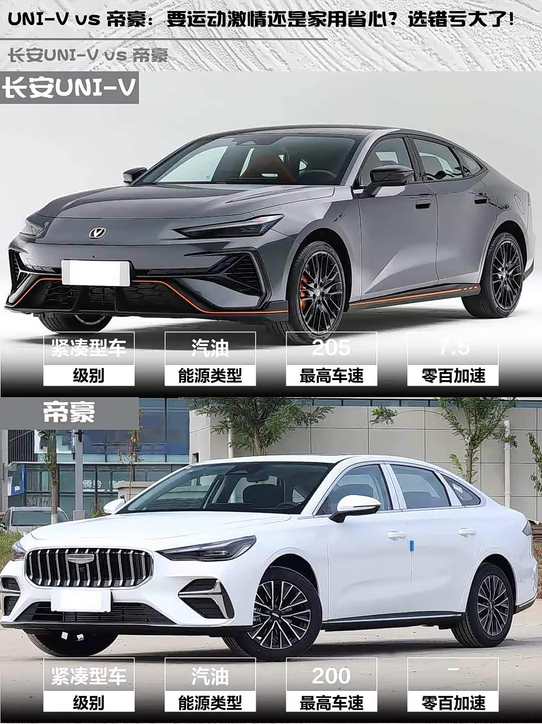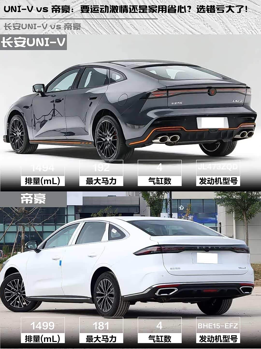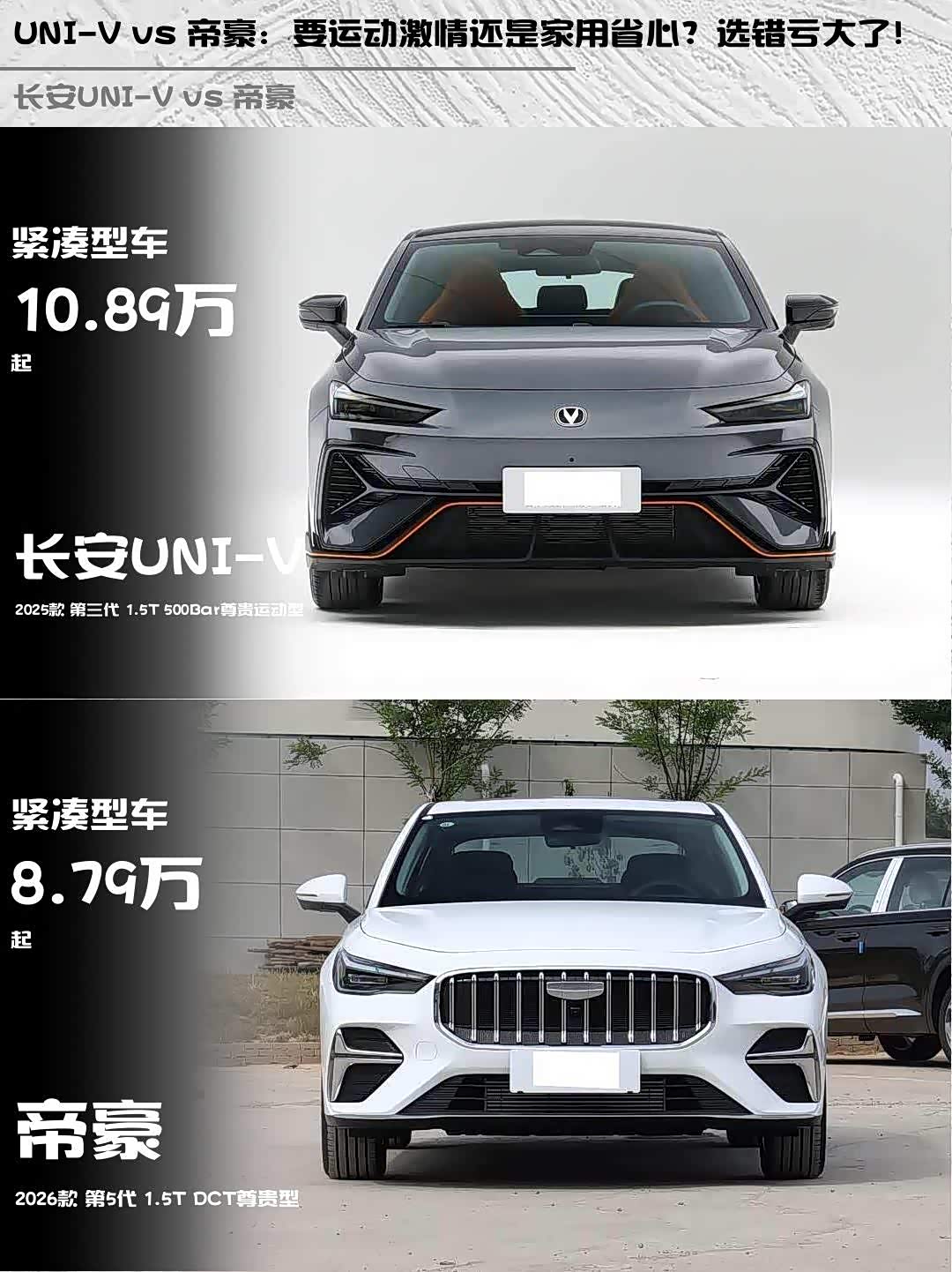 最近在选车的小伙伴看过来!今天给大家深度对比两款10万级热门家轿—— 长安UNI-V(参数|询价) 2025款 第三代 1.5T 500Bar尊贵运动型和帝豪2026款 第5代 1.5T DCT尊贵型,实测干货奉上🔥