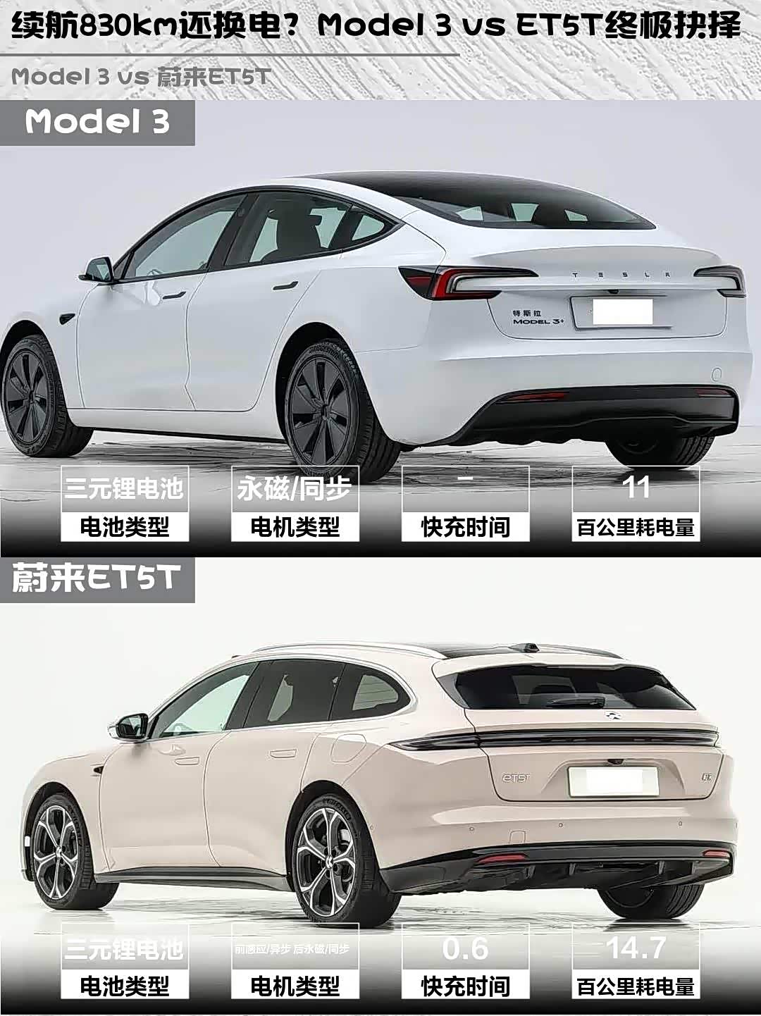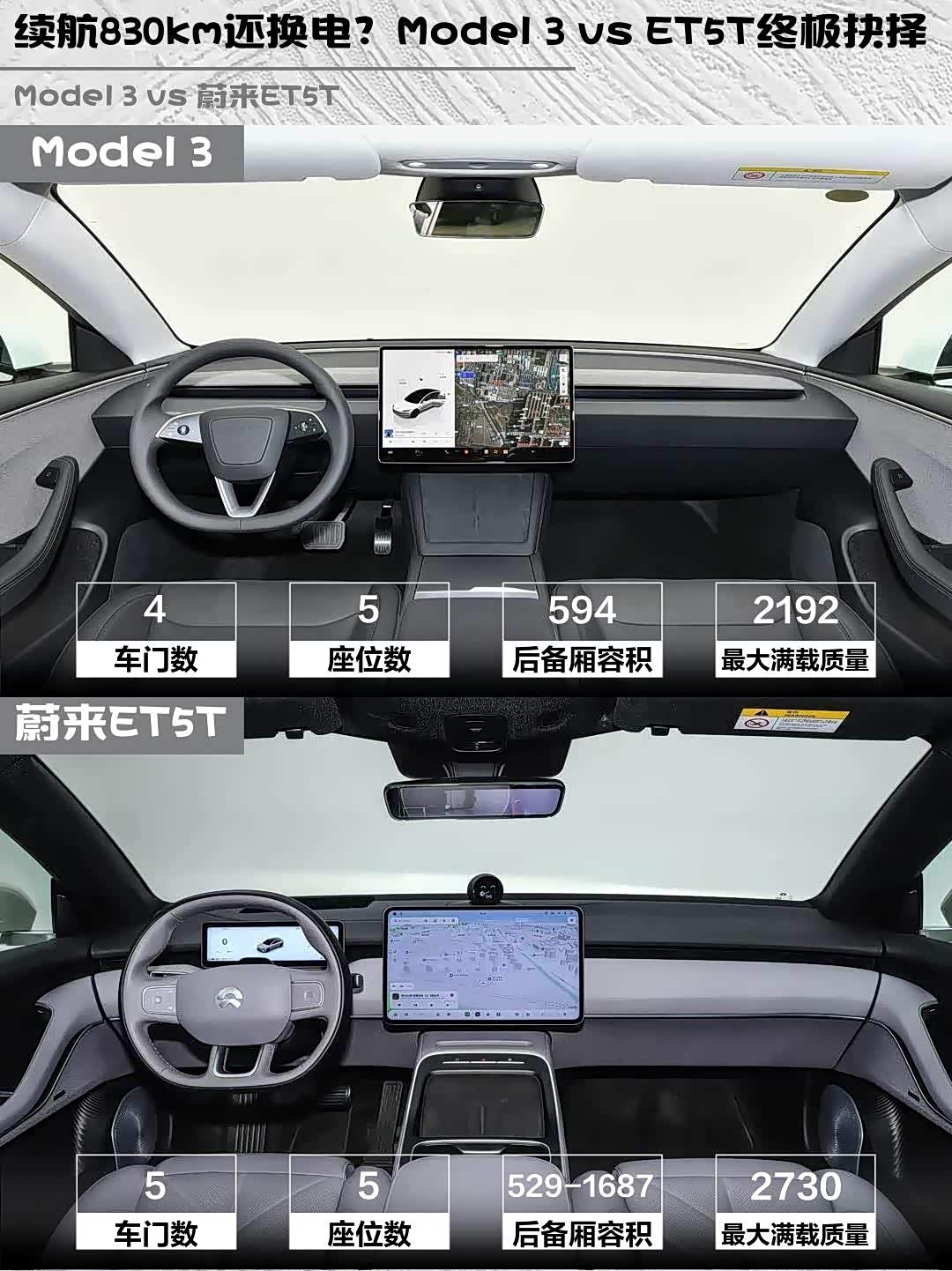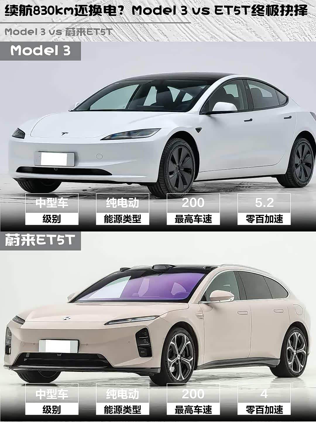 Model 3后驱版5.2秒破百已经够猛了,没想到ET5T双电机四驱直接干到4秒!不过日常开的话,Model 3的225kW功率完全够用,重点是续航更顶——78.4度电池CLTC 830km,比ET5T的100度电池710km还长,特斯拉的三电效率确实有一套。但ET5T的换电体系真香,路过换电站5分钟满血复活,适合经常跑长途的。