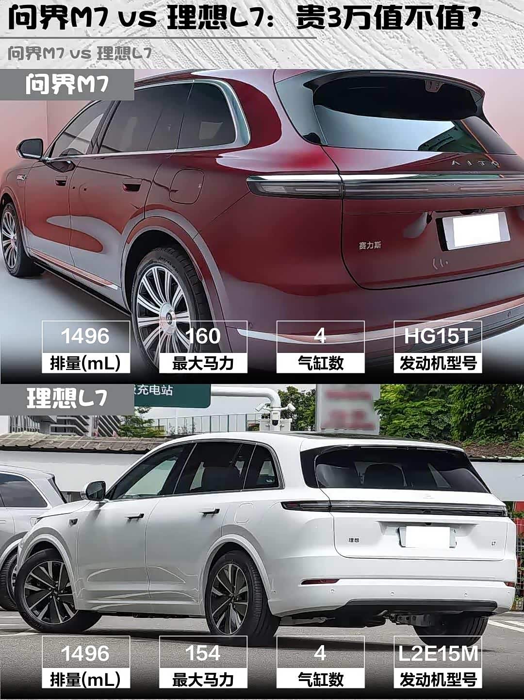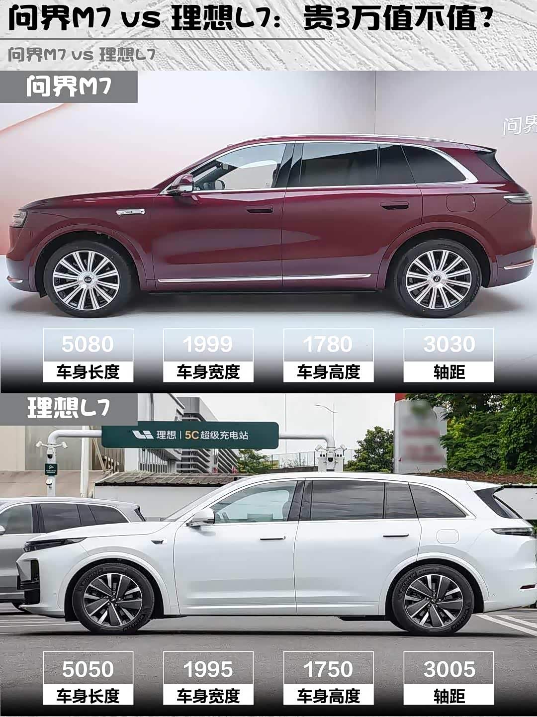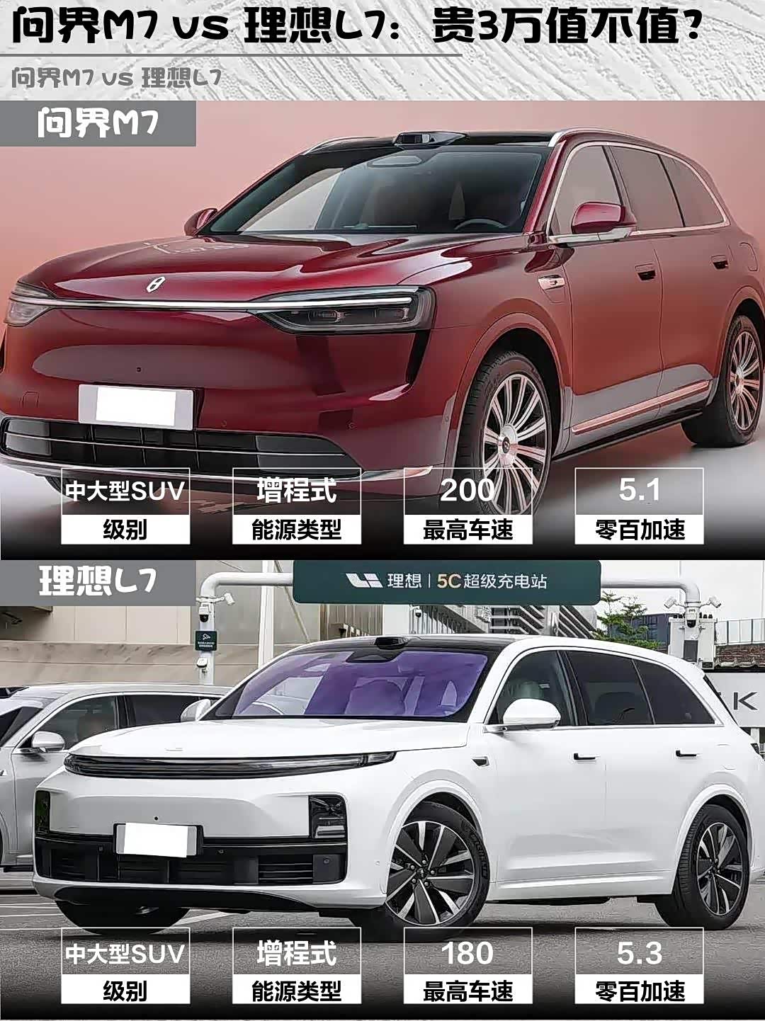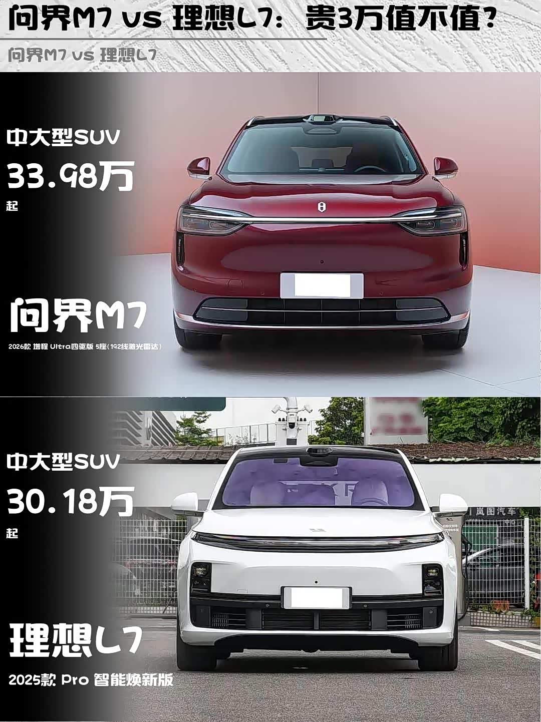 问界M7 Ultra四驱版33.98万,比理想L7 Pro贵3.8万,但多出激光雷达、更大电池、更快充电。理想L7 Pro的30.18万定价更亲民,适合预算有限又想要空悬的用户。