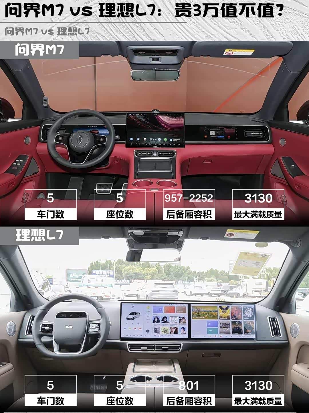 问界M7后备厢容积957-2252L,二排座椅放倒能当双人床!理想L7后备厢801L稍小,但后排“皇后座”模式很讨喜