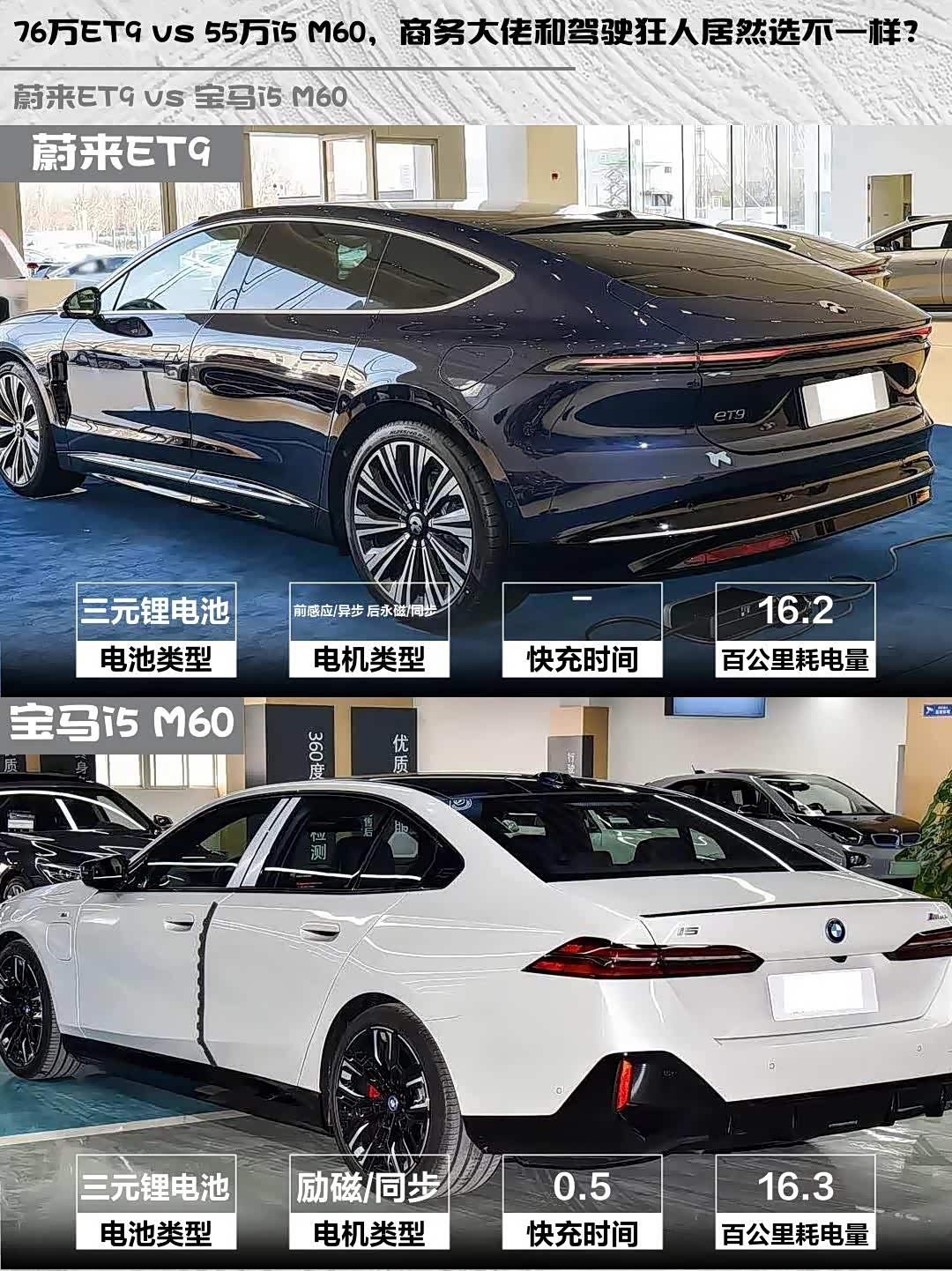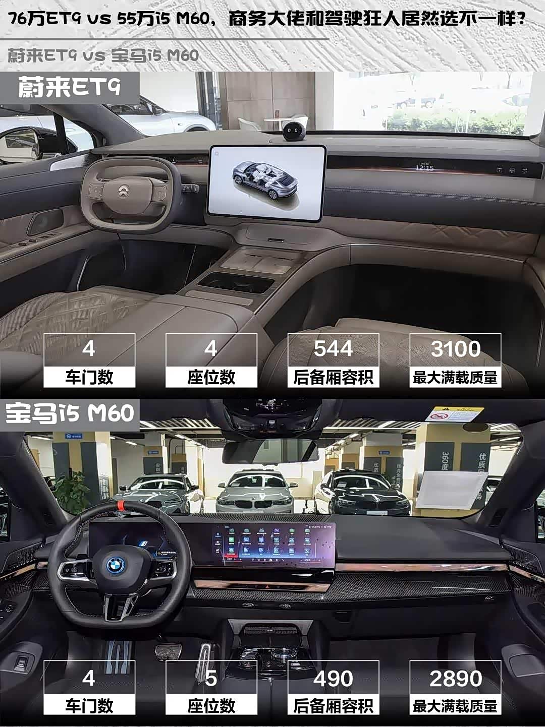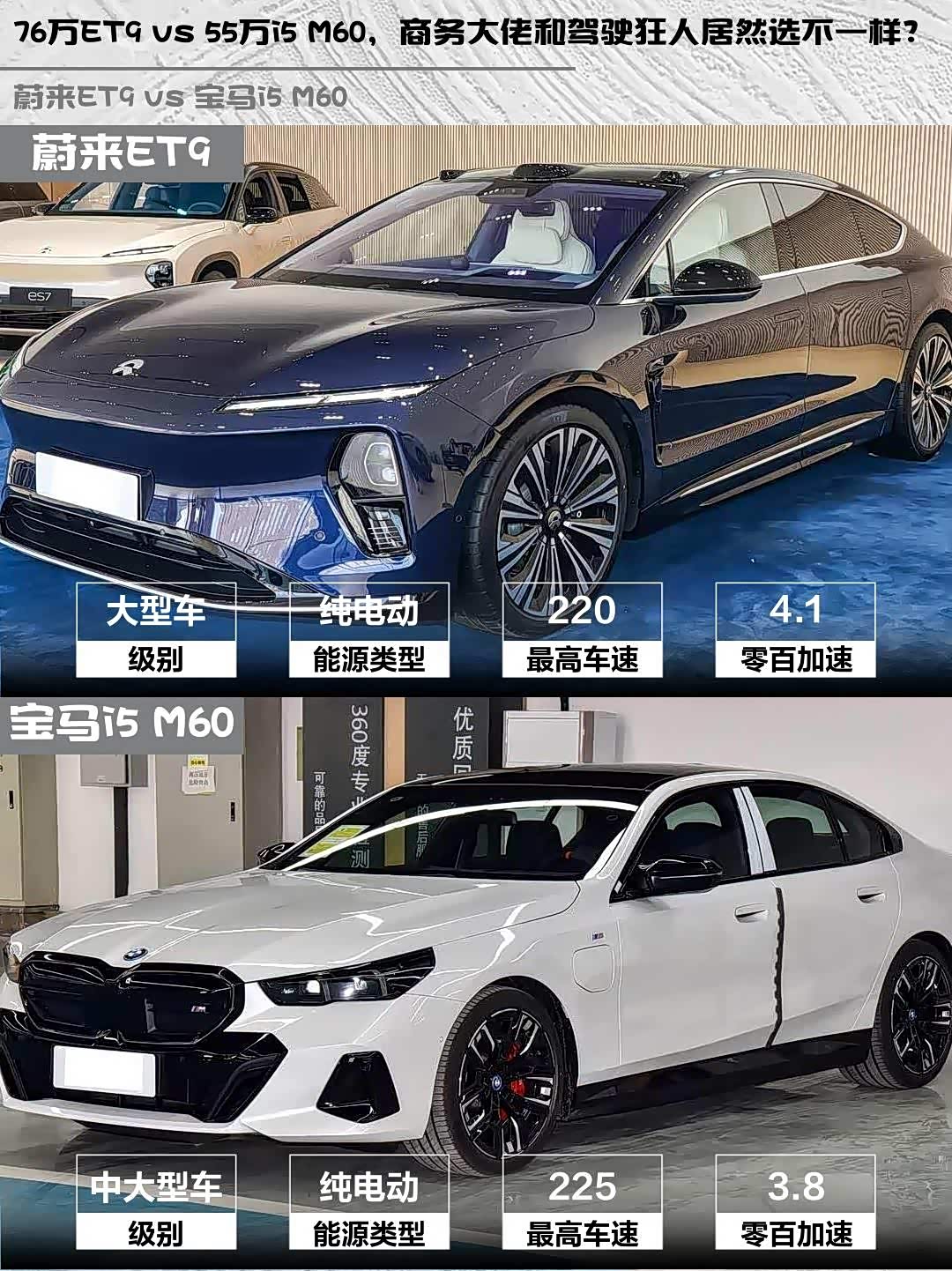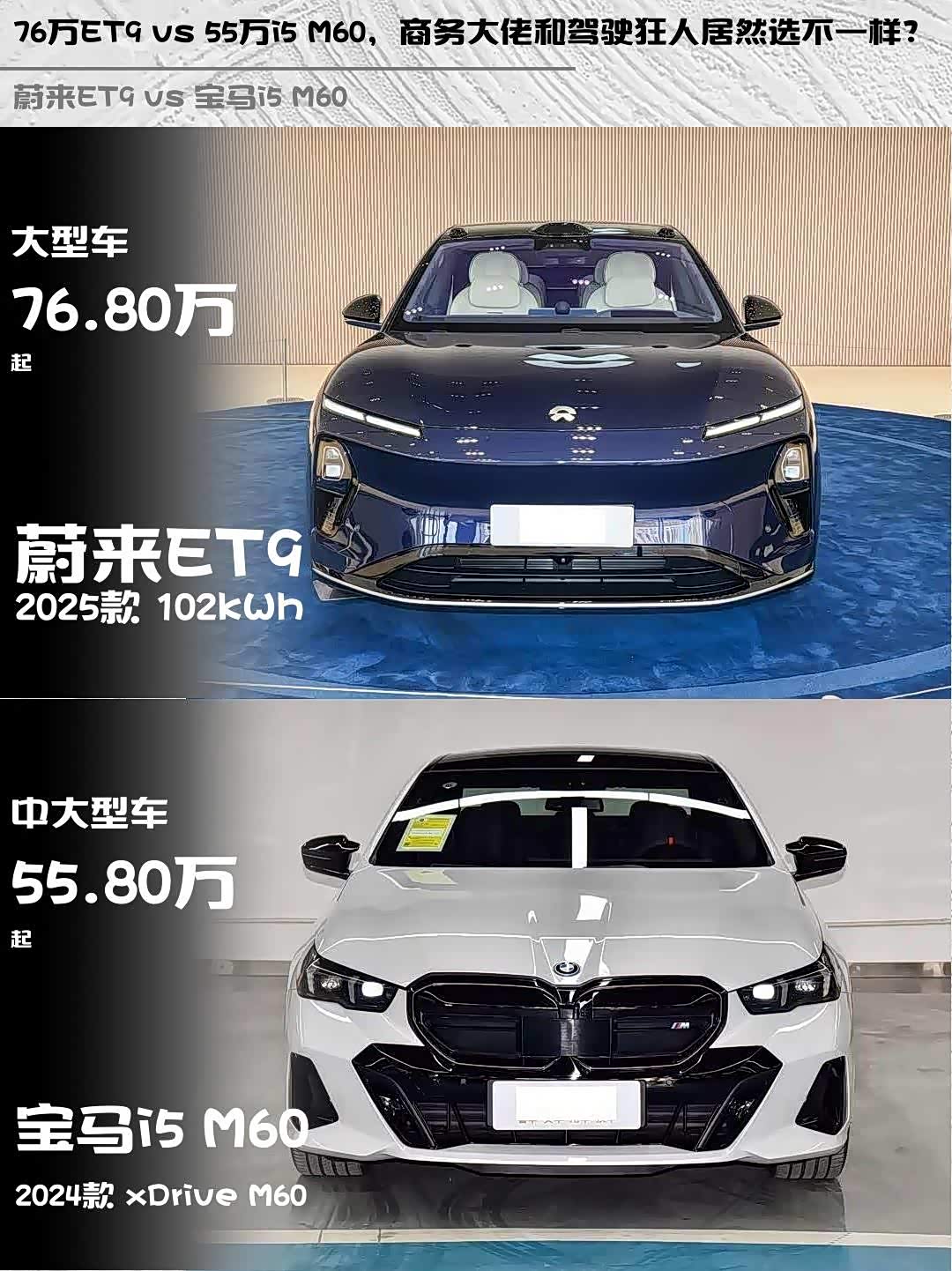 ET9卖76.8万走高端行政路线,i5 M60 55.8万主打性能控。预算够的直接冲ET9,要性价比和驾驶乐趣选i5 M60。不过听说宝马这款快停产了,现在入手可能抄底价?