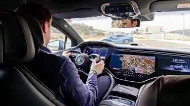 这项技术带来最直观的改变就是转向幅度:传统大轿车从左打死到右打死,方向盘需要转动超过500度(大概是两圈半打死的幅度),而新款EQS线控转向总共只需要转动170度(半圈不左右幅度)。以前开5.2米长的EQS在小区掉头、挤车位,得来回不停搓好几次方向盘,现在手腕轻轻一掰就能转到位。配合新款EQS标配的10度后轮转向,这么大一台豪华电动车,低速挪车灵活度居然能赶上小型家用车。