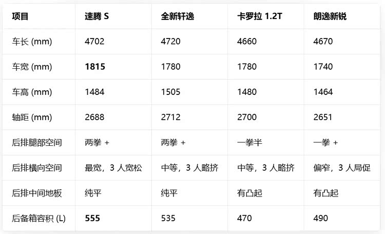 在空间方面,速腾S的车身长4702mm宽1815mm高1484mm,轴距2688mm,车身紧凑但空间利用率比较高。对比轩逸、卡罗拉和朗逸,它拥有相对充裕的后排腿部空间,还有家用刚性需要的后备箱容积。