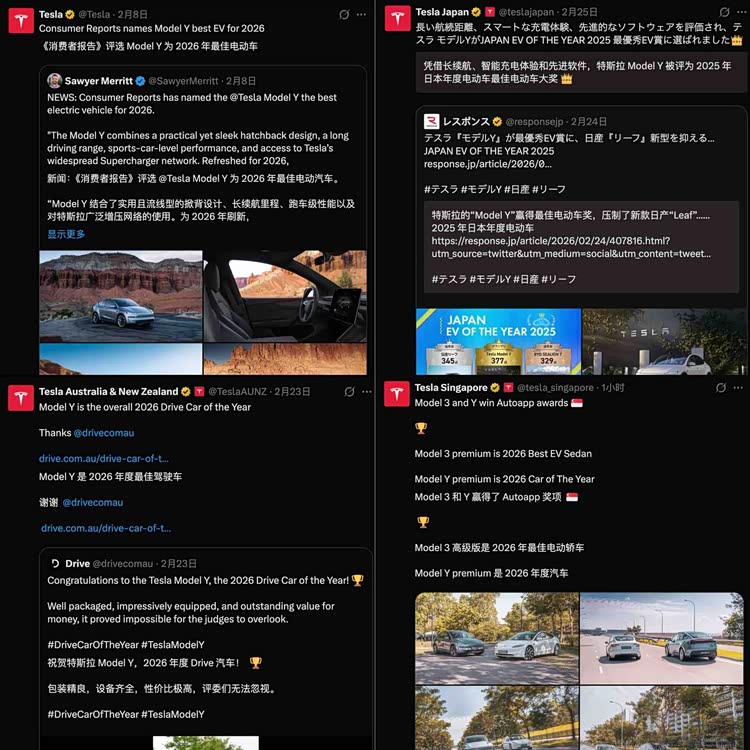 不仅在全球消费者中广受欢迎,各大媒体和权威机构测评中,特斯拉的硬实力也经得起考验。得益于优秀的三电系统、便捷的充电体验、常用常新的智能软件等优势,Model Y 在权威杂志《消费者报告》“2026年度十大最佳车型”榜单中获评“最佳电动车”。此外,Model Y还在澳大利亚与新西兰分别摘得“年度最佳驾驶车型”与“年度电动车”桂冠,并在日本获评“2025年度最佳电动车”。Model 3同样表现出色,在新加坡被评为“2026年度车型”及“最佳电动轿车”。特斯拉在菲律宾被TopGearPh评为“年度突破品牌”,并获“最佳新技术实施奖”。