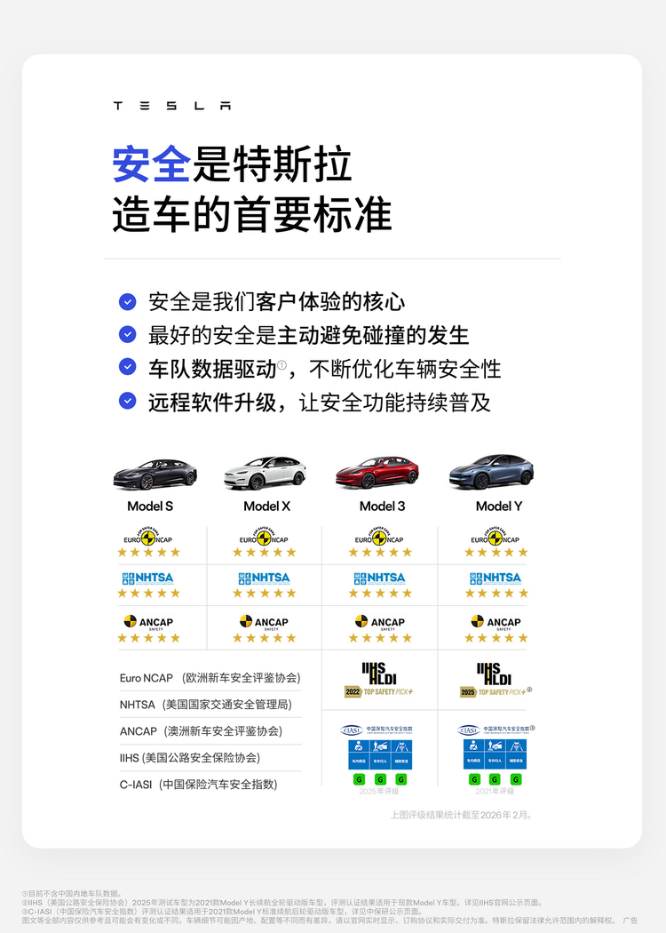 奖项之外,特斯拉还收获全球权威测评机构对其安全性的最高认可。秉持“安全至上”原则,特斯拉全系车型均按照全球最严苛的安全标准设计制造。目前,特斯拉S3XY车型已在美国国家公路交通安全管理局(NHTSA)、欧洲新车安全评鉴协会(Euro NCAP)、中国保险汽车安全指数(C-IASI)及澳大利亚新车安全评鉴协会(ANCAP)等全球多家权威机构的测试中获得“五星安全”评级,为用户提供全方位保护。