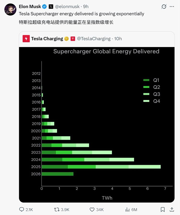 2026年第一季度交付报告显示,特斯拉储能装机量达到8.8吉瓦时。全球超充网络也在持续拓展中,为车主提供更省心的出行补能体验。据特斯拉官方数据,特斯拉超级充电站输出的能量正在逐年增长,2026年第一季度共输出1.8太瓦时的电力,同比增长22%,这一方面得益于特斯拉超充网络覆盖率及车主数量的增长,另一方面则是因为越来越多非特斯拉品牌的车主也选择特斯拉充电网络为车辆进行补能。截至2026年3月,特斯拉拥有遍布全球的75000多根超级充电桩、8000多座超级充电站,是全球直流充电网络覆盖最广泛的品牌之一,充电桩实时可用率达99.95%。