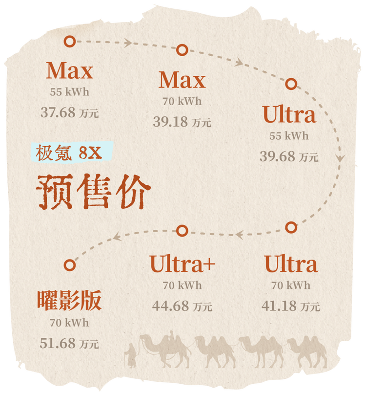 极氪 8X 之前已经公布了预售价,一共有 6 个配置,预售价区间为 37.68-51.68 万元。其中 51.68 万元的是曜影版,拥有专属的套件以及三电机系统。