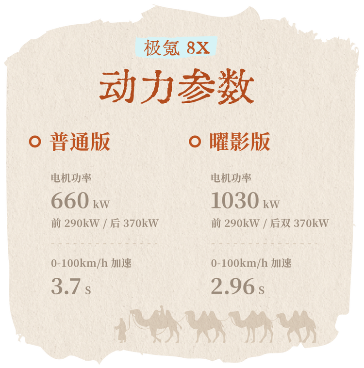 公路之王,首先动力需要足够强。极氪 8X 搭载的是前后双电机,综合最大输出功率为 660kW,0-100km/h 的加速时间仅为 3.7 秒。如果是曜影版,搭载的还是三电机,综合最大输出功率将达到 1030kW,0-100km/h 加速时间仅为 2.96 秒。