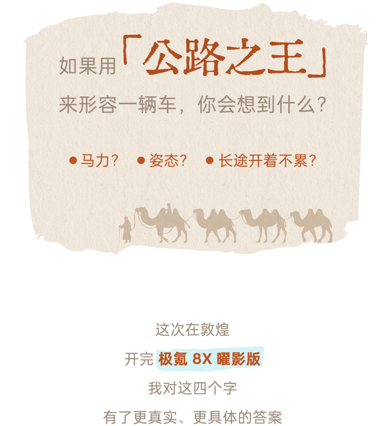 聊完了曜影版,接下来聊聊极氪 8X 的动态驾驶体验。这次极氪官方把试驾地点选择在敦煌,祖国的大西北,主打一个地广物博。开了 100km 的沙漠高速之后,我突然理解了为什么称极氪 8X 为「新公路之王」了。