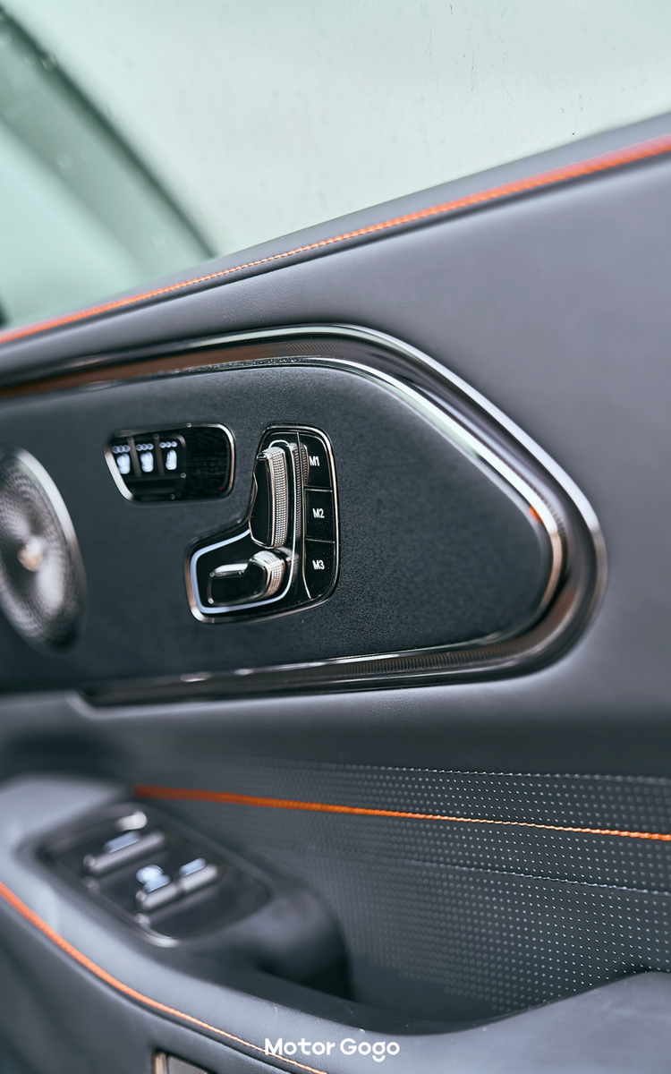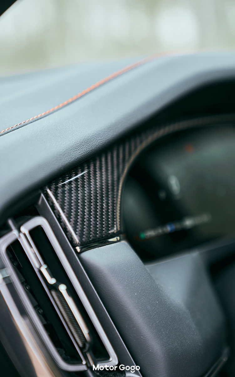 曜影版的内饰也非常明显,有点类似于 AMG 和普通版的感觉。纯黑的内饰,搭配橙色的缝线以及安全带,并且中控台部分区域还采用了碳纤维的饰板。