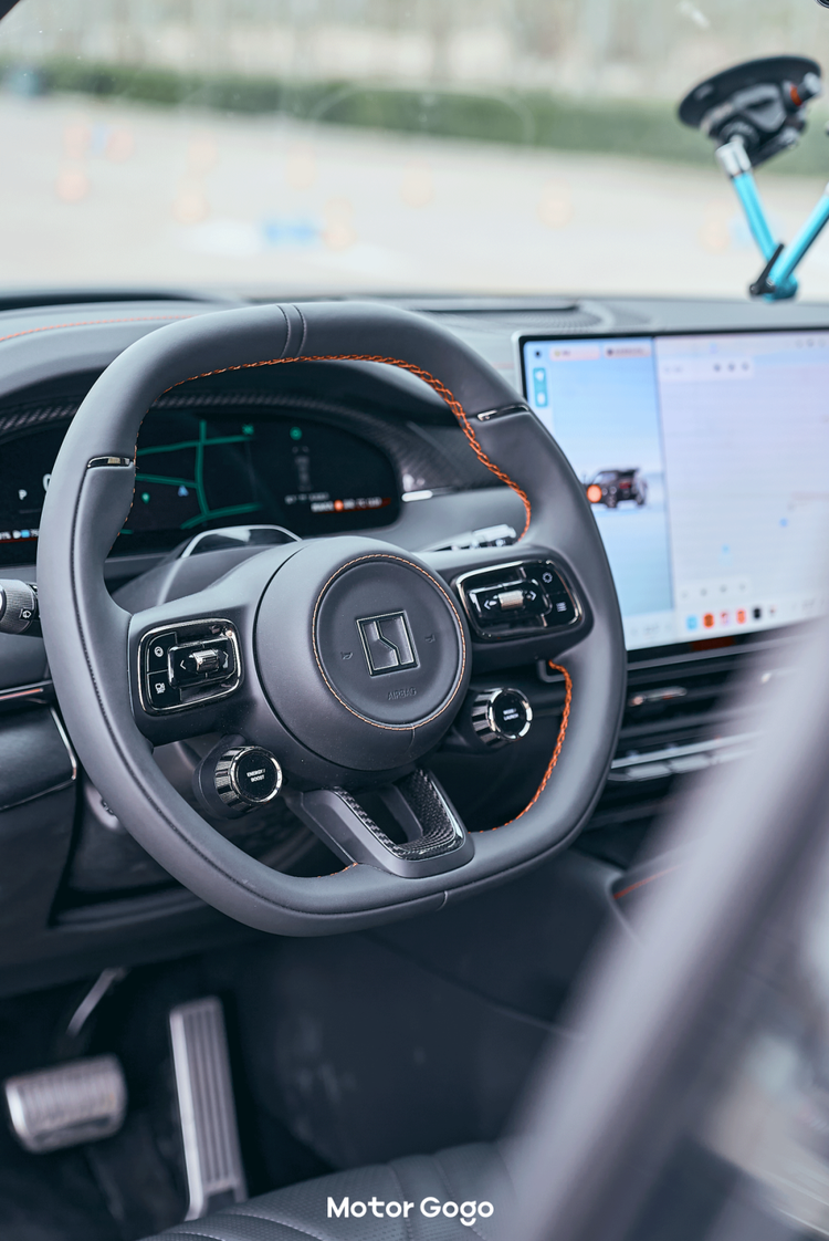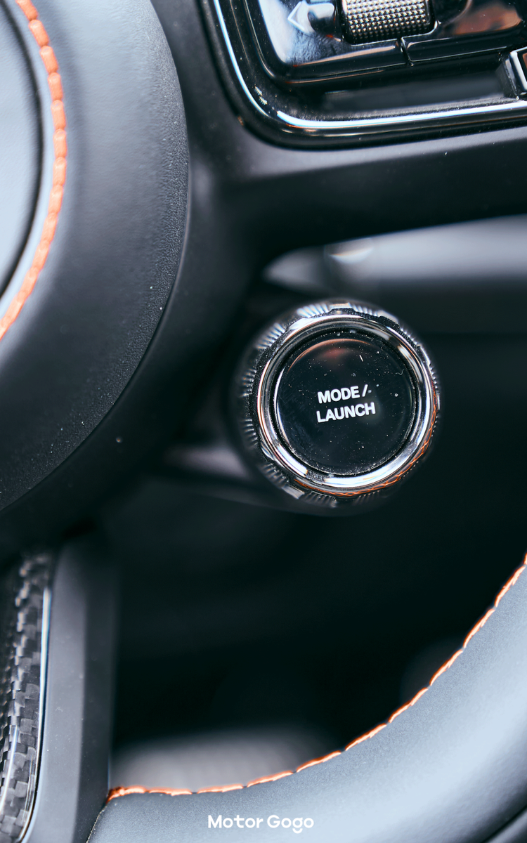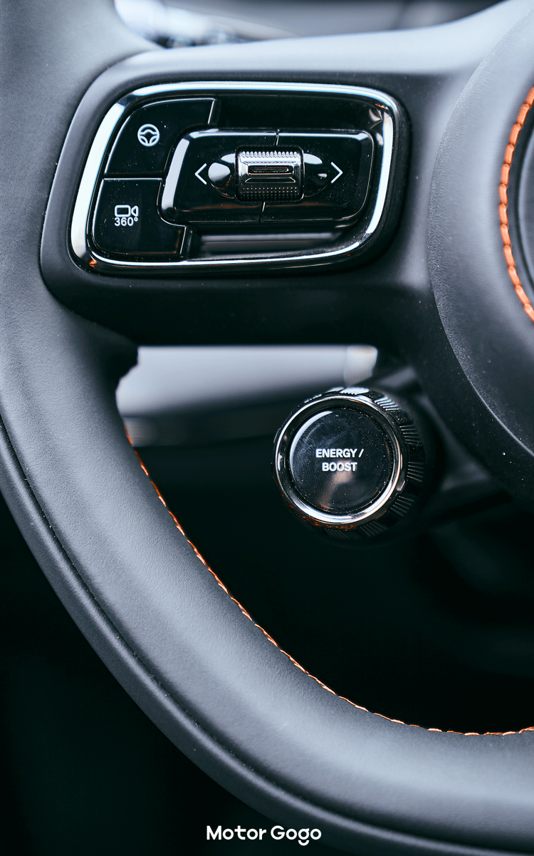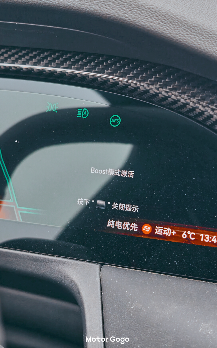 最主要是曜影版的方向盘增加了两颗性能按键,左边是一键「Boost」切换超频模式,右侧则是可以调节驾驶模式、空悬等等。