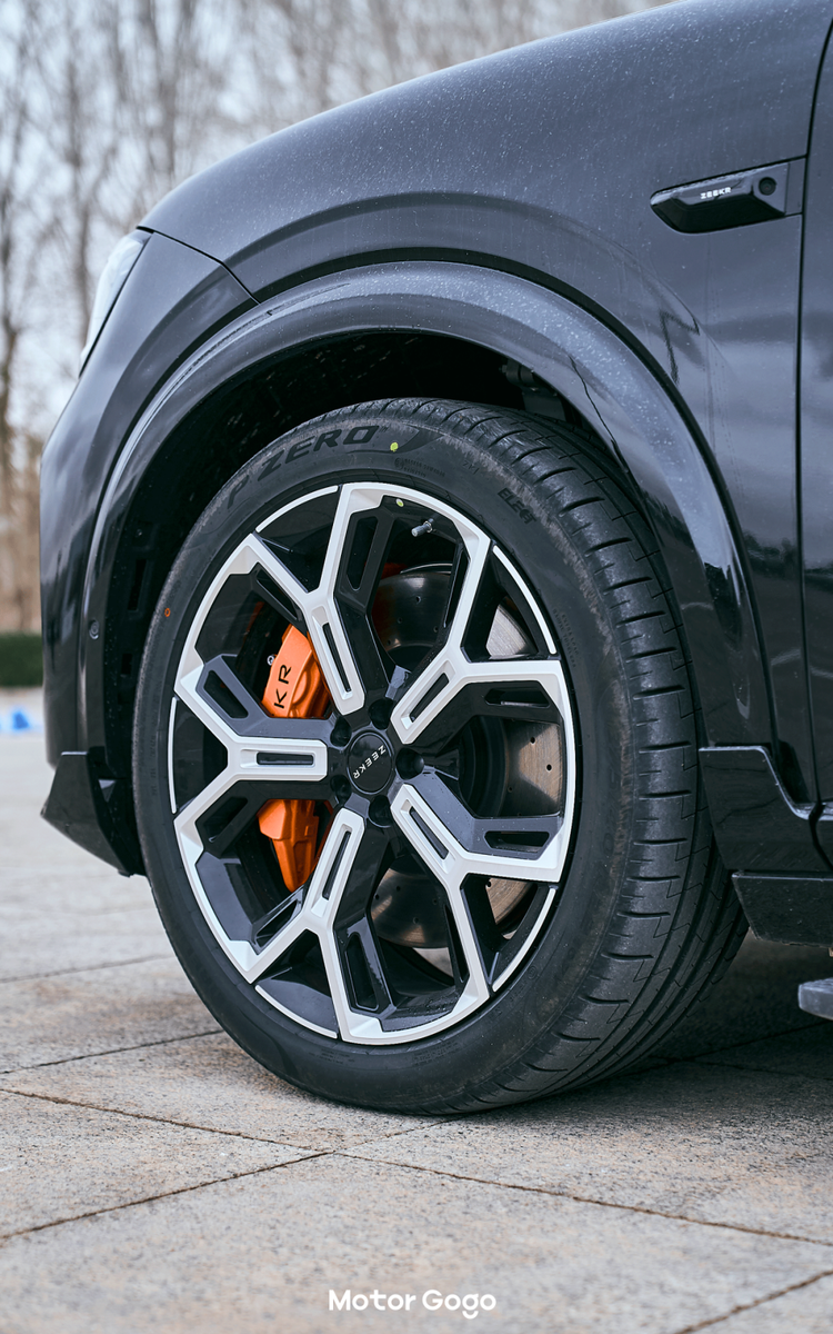 曜影版采用了前窄后宽的鸳鸯胎,前轮是 275/40 R22,后轮是 315/35 R22 的宽胎。但本身极氪 8X 曜影版也采用了宽体套件,所以后轮的宽胎实际看起来并不会显得很宽,大家可以放心。