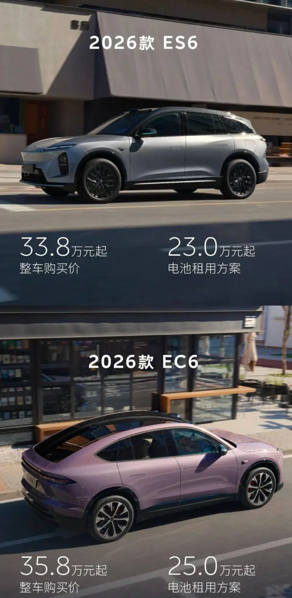车家号·0浏览·2026-04-03 10:31 · 广东4月2日消息,蔚来汽车官宣2026款ES6、EC6正式上市。ES6整车购买价33.8万元起,电池租用方案23万元起;EC6整车购买价35.8万元起,电池租用方案25万元起。
