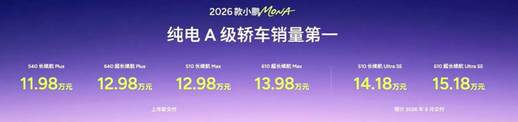 4月2日,2026款 小鹏MONA M03(参数|询价)正式上市,新车共有6款配置,售价区间为11.98万~15.18万元,新款车型在车身颜色、内饰、车机、辅助驾驶等方面都进行了升级,其中Plus、Max版本的四款车型上市即交付,Ultra SE版本两款车型将于今年8月交付。