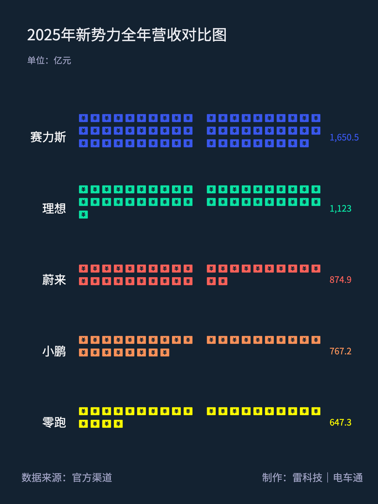 但营收排名完全是另一番景象,赛力斯1650.5亿遥遥领先,理想1123.1亿排第二,蔚来874.9亿第三,小鹏767.2亿第四,零跑647.3亿反而垫底。【P2】