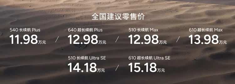 540长续航Plus 11.98万元、640超长续航Plus 12.98万元、510长续航Max 12.98万元、610超长续航Max 13.98万元;