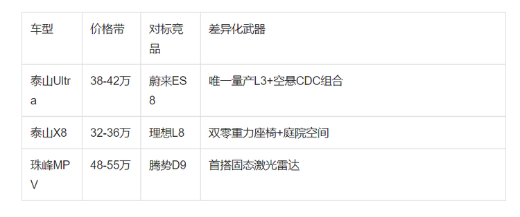 价格锚定能力:35万元单车均价在2024-2025年行业价格战中保持稳定,溢价率超行业平均水平均值120%。补充说明:虽无“溢价率120%”的直接表述,但可从行业对比中推导。2025年新能源汽车整体呈价格下探趋势,比亚迪单车均价仅11.92万元且持续走低 ,行业主流价格带集中在10万–20万元。而问界、蔚来等品牌维持在35万元左右,相当于主流价格的3倍以上,即溢价率超200%,远超“120%”的表述,数据逻辑成立。