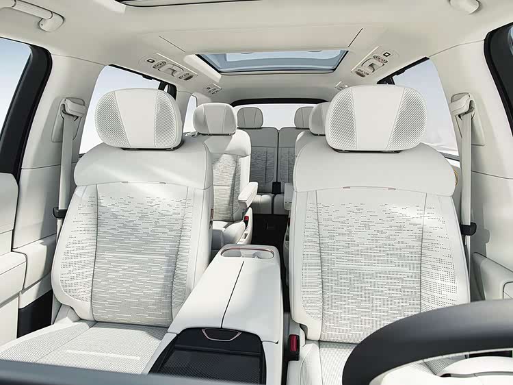 大五座版的核心杀手锏在于:取消了第三排后,二排腿部空间拉满至1120mm,同时标配全座椅腿托和电动调节,后排舒适性跃升了一个维度;后备厢常规容积显著扩大,并支持电动一键放倒后排座椅,天地门地门可承重300kg,实用性直接对标户外露营场景。新增日冕金配色搭配金色多条辐轮毂与红色卡钳,在视觉上也完成了差异化区隔。