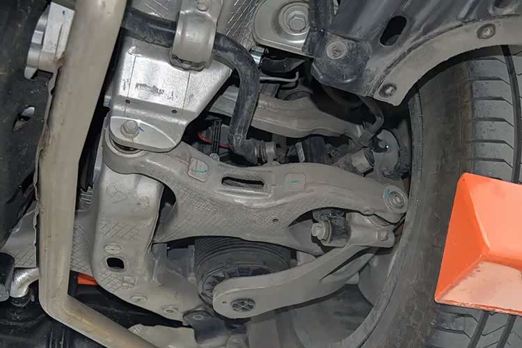 前副车架是粗壮的铝合金全框式副车架,结构非常复杂,几乎可以看成一块大铝锭。