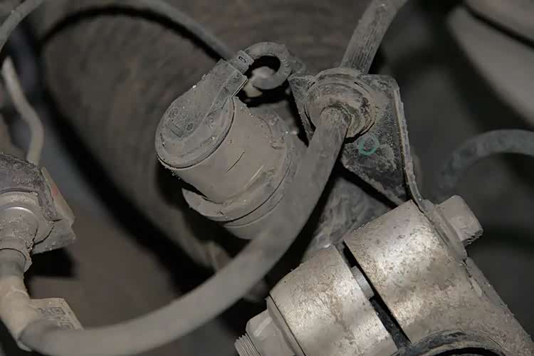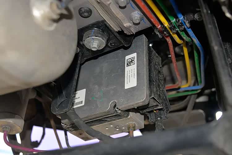 这辆车采用空气弹簧加软硬可调避震器,避震筒上能看到调节软硬的电磁阀。