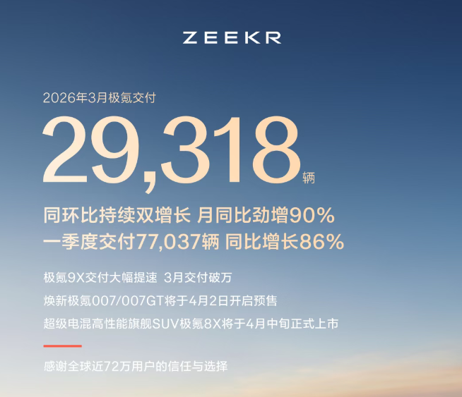 零跑汽车堪称3月车市最大黑马,全系交付量达50029辆,同比增长35%,环比更是暴增78.25%——这意味着其“全域自研”战略正逐步释放规模化红利。旗下C系列、B系列及刚启动交付的A10,精准戳中主流消费市场痛点;“增程+纯电”的双动力布局,则在3月油价回升的背景下,优势愈发凸显。