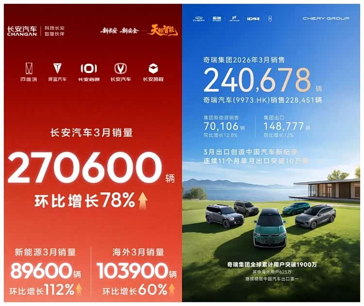 长安汽车3月劲销270600辆,环比大涨78%,其中新能源销量为89600辆,环比暴涨112%;海外畅销103900辆,环比增长60%。奇瑞集团则交出单月销量240678辆的成绩单,同比增长12.1%,新能源销售70106辆,同比增长12.8%,出口148777辆,同比增长72%,连续11个月单月出口突破10万辆,持续领跑中国汽车出口赛道。