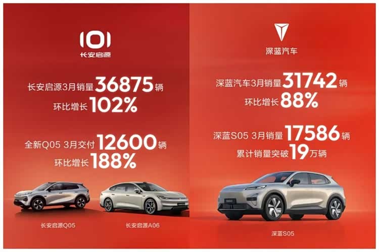 长安启源销量36875辆,环比增长102%,其中全新启源Q05在3月份交付12600辆,环比增长188%。深蓝汽车销量为31742辆,环比增长88%,深蓝S05销量为17586辆,累计销量突破19万辆,进一步巩固了主流新能源市场地位。阿维塔则在高端智能电动领域稳步进阶,3月交付量达5143辆,其11、12系列凭借智能化与品牌调性的差异化定位,逐步赢得高端用户的青睐。