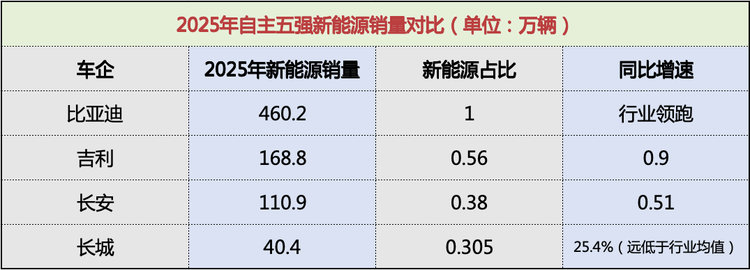 2022—2025年是中国汽车颠覆全球格局的黄金三年,自主五强呈现冰火两重天:比亚迪、吉利、长安、奇瑞全线爆发,销量翻倍增长;长城却陷入停滞,增速几乎为零,彻底跌出第一梯队。