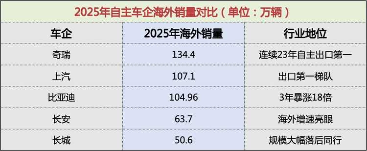 数据结论:2025年中国汽车出口总量达832万辆,登顶全球第一大汽车出口国,而长城海外销量仅为奇瑞的37%、比亚迪的48%,在全球市场的扩张速度、影响力全面落后,中国汽车全球化的辉煌成果,与长城几乎无关。