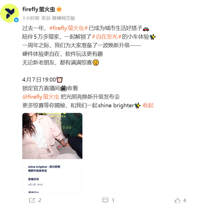 蔚来官宣:firefly萤火虫焕新升级发布会定档4月7日