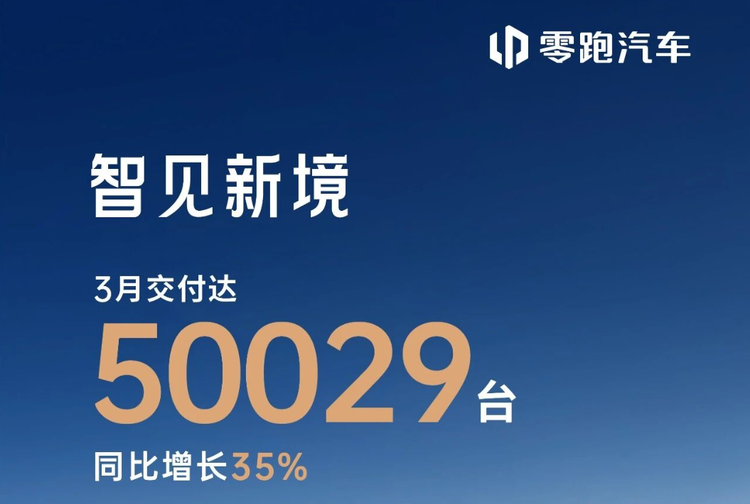 2026年4月1日,零跑汽车公布了3月交付成绩单:全系交付50029台,同比增长35%,环比暴涨78.25%。零跑也成为当月唯一交付量突破5万台的新势力品牌,遥遥领先第二名的理想汽车(41053台)。